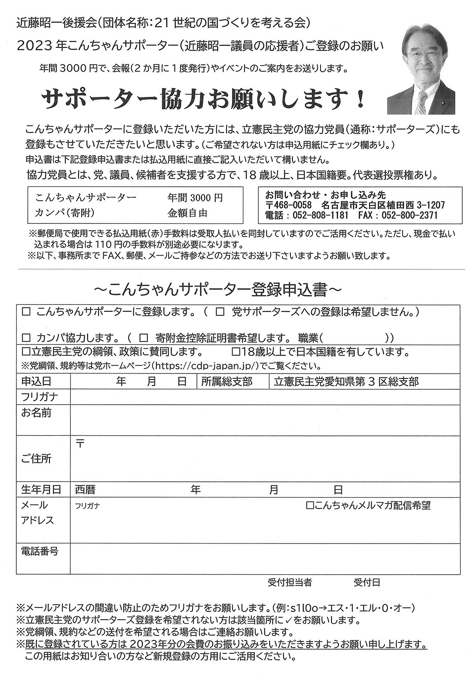 近藤昭一後援会(21世紀の国づくりを考える会)では、2023年こんちゃんサポーターを募集しています。ぜひ、ご参加ください。