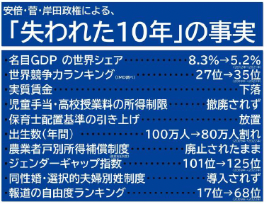 日本の政治は、「失われた30年」と言われるようになっています。物価高の原因となっている極端な「円安」も、アベノミクスによる行き過ぎた金融緩和が大きな原因であり、株価が上がっても、普通に暮らしている人々の生活を脅かしています。