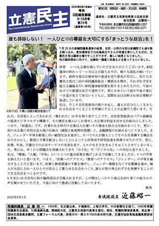 拝啓 いつも会報を読んでいただきありがとうございます。参院選挙が終わって一ヶ月以上が経ちますが、様々な混乱が続いています。政府与党は石破首相の進退を巡り意見が対立し、私たち立憲民主党は二回の両院議員総会・懇談会を開き、それぞれ予定を超える議論を行い参院選挙総括案を取りまとめたものの、今後の向けての展望は未だ不透明です。更に日本という国の今後の進むべき道が見えて来ないとともに、国際社会は分断され相互理解が後退しています。