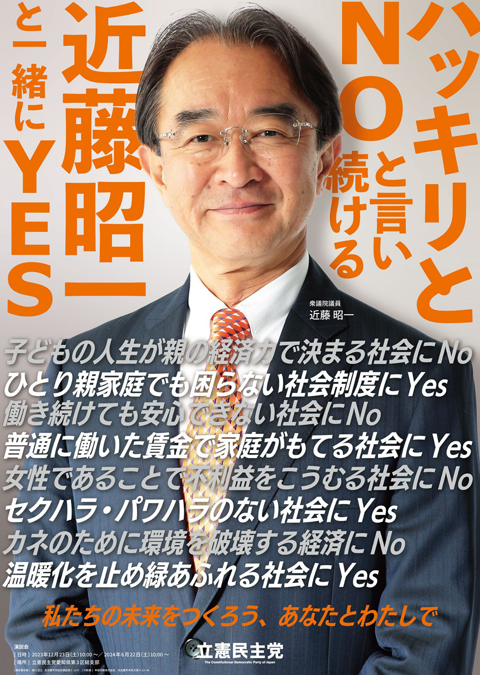 新ポスター作成しました。 ~ハッキリとNOと言い続ける近藤昭一と一緒にYES~ 私たちの未来をつくろう、あなとわたしで 愛知県第3区総支部内に(名古屋市昭和区・天白区・緑区)に貼ってくださる方ご連絡ください。