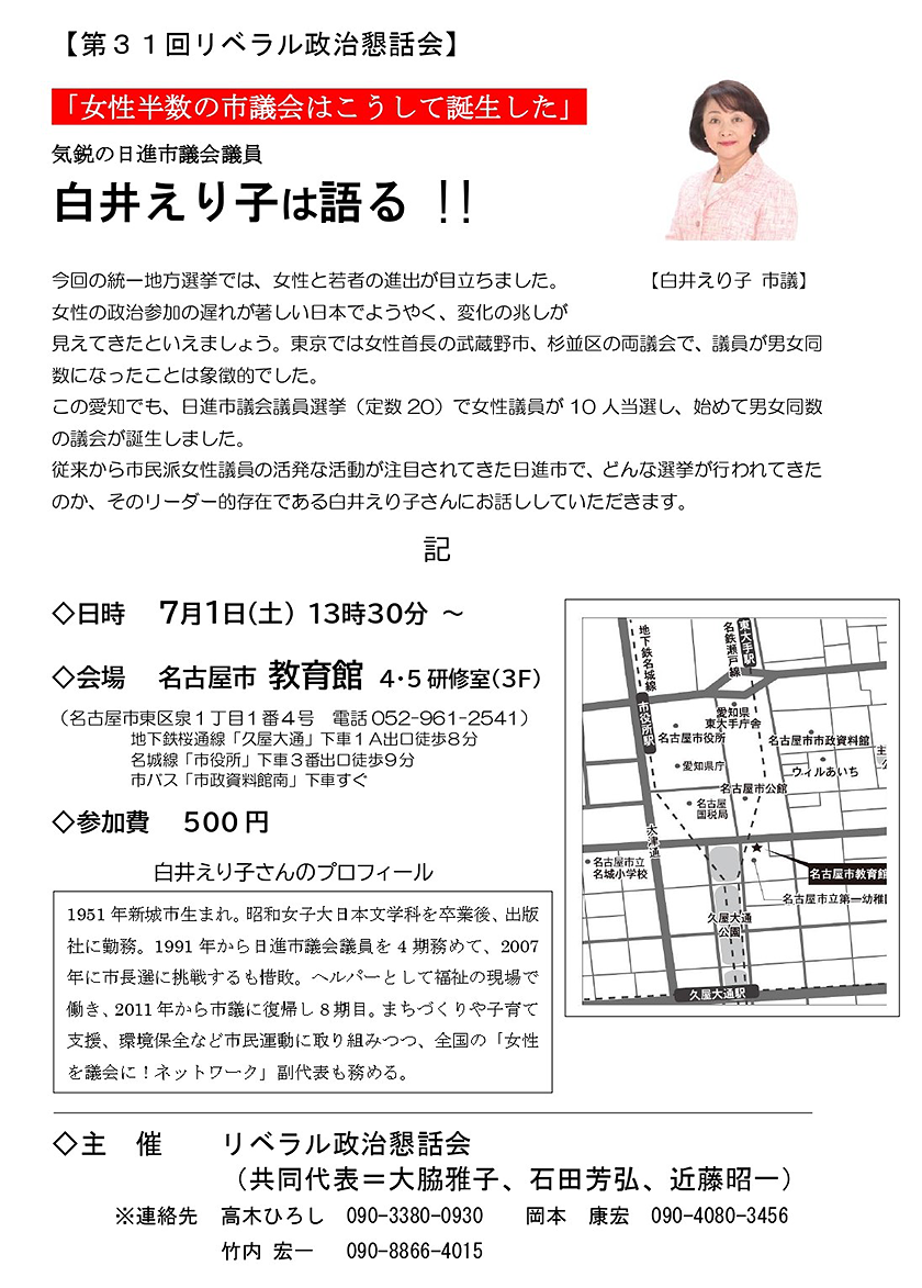 明日7月1日(土)13:30から、近藤議員が共同代表の一人である「リベラル政治懇話会」は日進市議会議員白井えり子さんをお招きしてお話を伺います。
