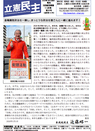 拝啓 新しい年が明けました。本年は政治資金問題に終止符を打ち、生活者のための政治実現にしっかりと頑張ります。驚くべき激震は、臨時国会閉会直前に起こりました。政治とカネの問題を未だに解決出来ていない自民党政治にはNOを突きつけなければなりません。